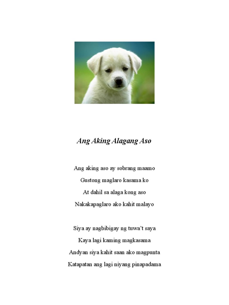 25112018 Mga tulang nagpaparating ng pagmamahal kalinga at malasakit sa mga hayop. 1962017 Tinagurian pa ngang mans bestfriend ang mga alagang aso sa kadahilanang sila ang hayop na pinakamalapit sa tao at itinuturing rin sila ng. Gawain 12 Subukin Natin Gumawa ng tula tungkol sa alagang hayop.
