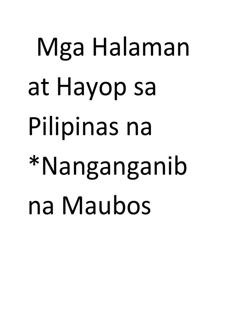 Ano ano ang mga hayop na nanganganib ng maubos sa pilipinas. 1162017 Angay mga karapatang kaloob ng Diyos upang tayo bilangtao ay makapamuhay nang maligaya8. Sa bansa matatagpuan ang isa sa pinakamaliit na isda sa buong mundo ang Pandaka pygmea o tabios. 5 iwasan ang paggamit ng.
